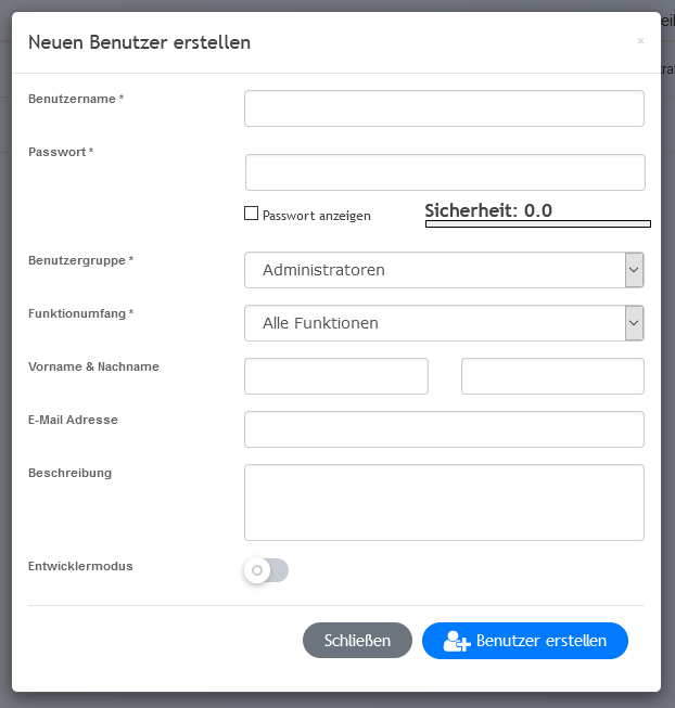 Mit einem Klick auf den „Neuen Benutzer anlegen“-Button erstellst du einen neuen Benutzer. Es erscheint eine Aufforderung sämtliche Daten einzugeben. Beim Klick auf den Bleistift lassen sich die eingetragenen Daten bearbeiten und es erscheint dasselbe Fenster wie beim Hinzufügen.